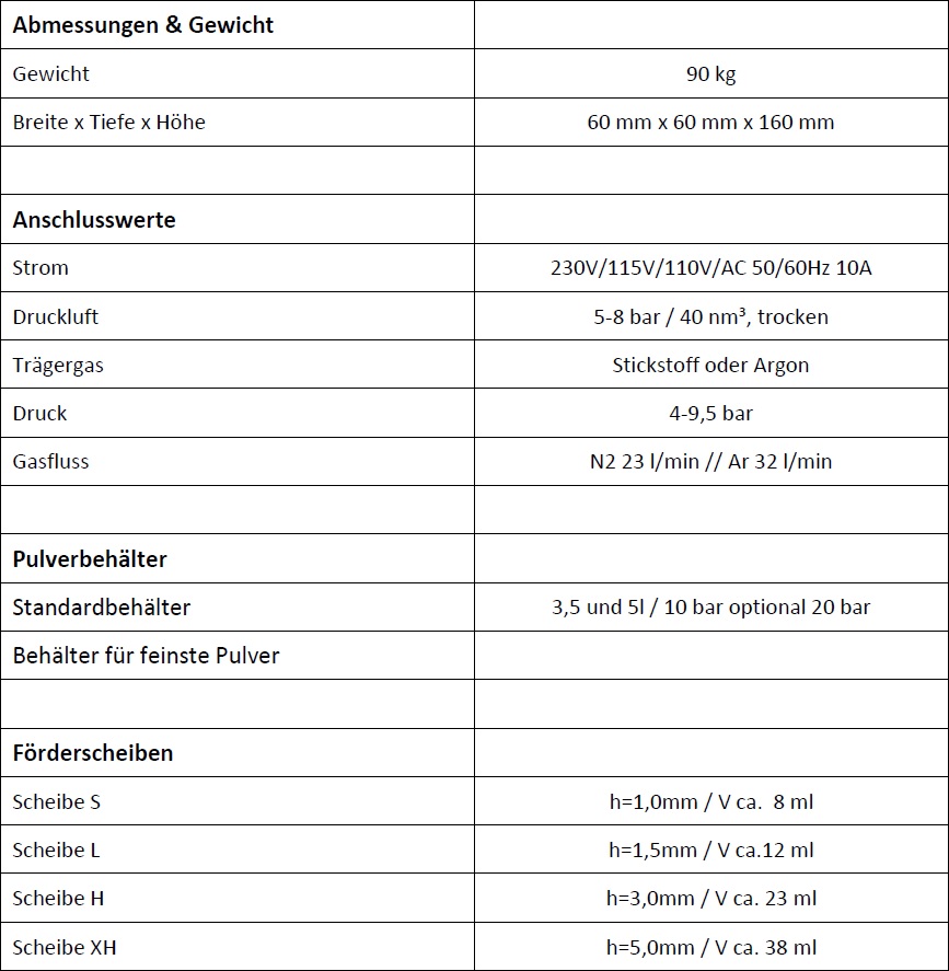 Aufgrund des modularen Behältersystems lassen sich <<3μm submikrone Pulver, <10μm superfeine Pulver, <25μm feine und Pulverkörnungen im Bereich 5 -125μm fördern. Wer HVOF-Stahlen will, kann mit dem CPF2-S Strahlpulver bis zu einer Körnung von <700μm (EKF 60) fördern.